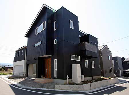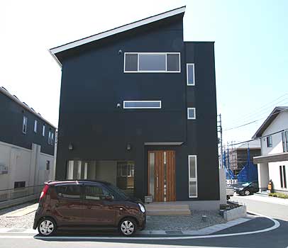 黒い金属サイディングにホワイトサッシがシャープな外観を演出します。