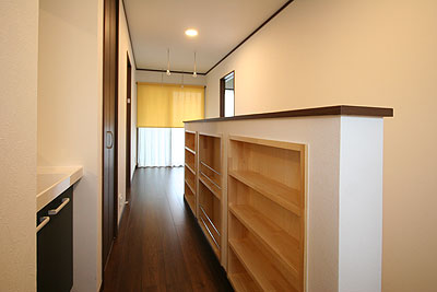 2階廊下には壁厚のマガジンラックと本棚を造作しました。