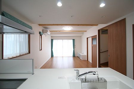 | 18帖のL・D・Kには一部天井を高くして梁現しで仕上げました。 |