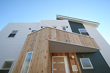 | 白を基調に緑を配したガルバの外壁とアクセントにウエスタンレッドシダーを張った玄関まわり。片流れとフラットを組み合わせた屋根により、デザイン的な外観を演出しました。 |