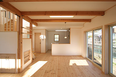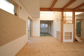 梁を見せたリビングです。壁は純白の珪藻土で仕上げ、パイン無垢床材とマッチして落ち着きのあるくつろぎ空間を演出してくれています。