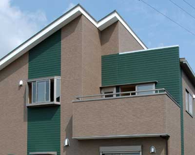 バイクの出入りを考えた両開きのドア。ご主人お気に入りのグリーン横ラインのサイディング。2階ホールの窓からは、富士山が正面に見ることができます。