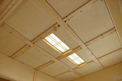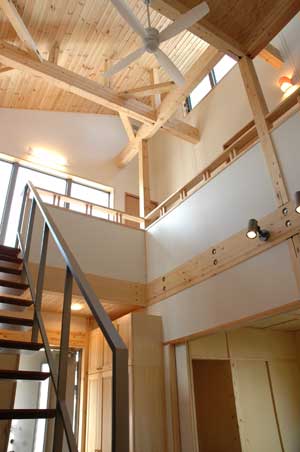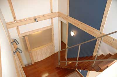 | 2階の廊下に立つとパイン材の天井、表わしの柱・梁、木の手摺り、寝室とロフトの障子と木のぬくもりがいっぱいの、古民家そのものです。 |