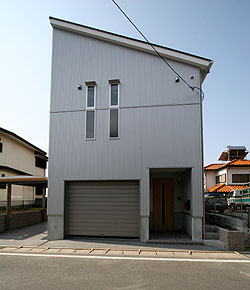 閑静な住宅街に片流れ屋根のシンプルな外観、シルバーメタリックのガルバが際立つガレージハウス。