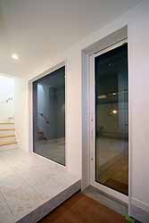 玄関にはガレージ内からのアクセスも可能です。車で帰宅した時は、こちらの出入り口から室内に入れば雨にも濡れません。玄関からは大型の窓越しに愛車を眺めながら、2階へ上る階段へ。