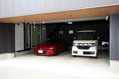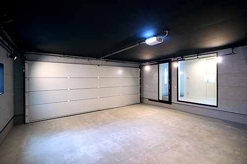 間口6.37m、奥行き5.91m(22.75帖)の大型ガレージは、2台並列駐車も余裕の空間です。出入口のシャッターは巻き取り式ではなく、オーバースライダーになっているので、開閉時間も短く、音も静かです。