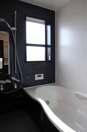 | ダーク色でシックな浴室。断熱浴槽とプッシュタイプの節湯水栓で省エネにもなっています。 |