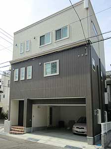 沼津駅にほど近い敷地面積23坪という限られた条件の中、5.5mの開口を確保して2台並列ビルトインガレージを1階に設けたSE構法による都市型3階建て住宅です。