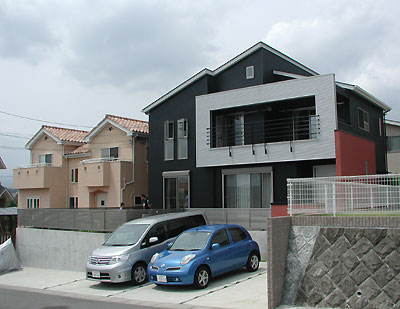 黒い外壁からシルバーの金属サイディングが浮かび上がる個性的な外観が、分譲地内でも一際目を引きます。