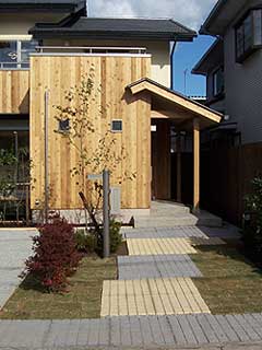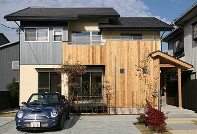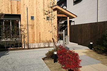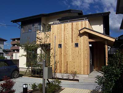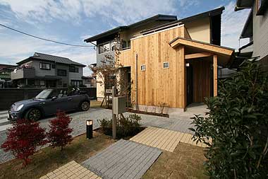 レッドシダーの外壁が印象的です。シンプルな切妻屋根で「新和風」のテイストで仕上げられています。