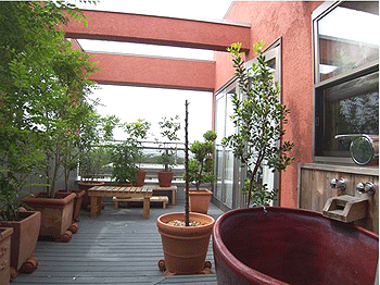 | 「露天風呂につかりながら海を眺めたい」という希望から設計がスタートしました。そのために、南面(海側)の隣家の位置・高さから、まず2階のベランダの高さ・配置が最初に決まりました。信楽焼きの露天風呂にお湯を張り人が入る・・・それだけで、400kg.を超える重量になってしまいます。在来木造等では不安なこのような要望も、SE構法を用いることにより、安全に耐震等級3級の建物を実現しました。 |