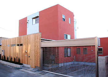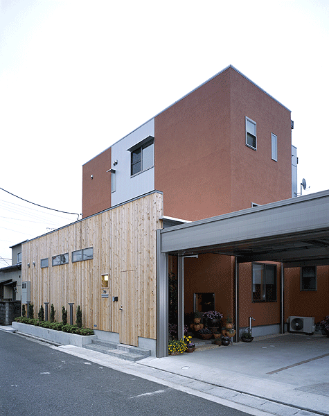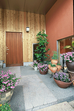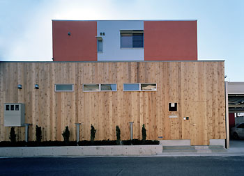 道路を歩いている人からは家の中が見えないように窓は天井付近に有るだけです。ウエスタンレッドシダーの板塀の様な外壁とガルバリュームの金属、そしてデラクリートの塗り壁のコントラストが大変美しい建物です。