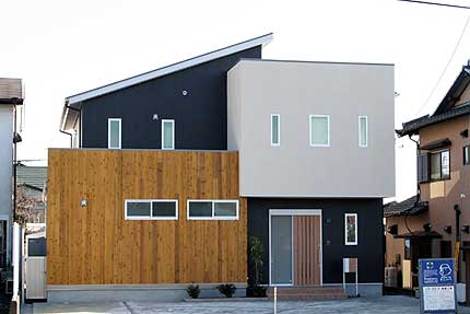 | 片流れとボックスの組み合わせのスッキリとした外観に、塗り壁と木の外壁がアクセントになっています。玄関上の塗り壁部分が1.2mオーバーハングしている事で押し出し感のある印象に仕上がりました。 |