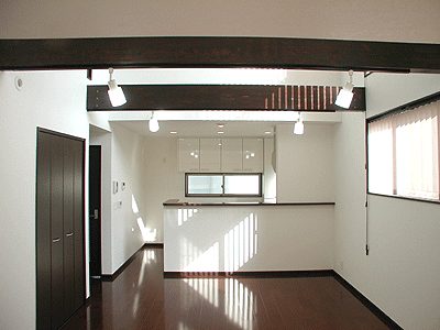 ダークブラウンと白の組み合わせの内装がモダンなLDKを演出します。 |