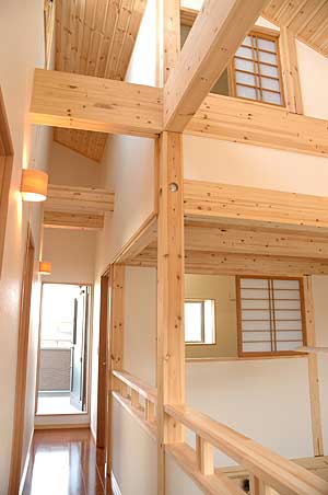 2階の廊下に立つとパイン材の天井、表わしの柱・梁、木の手摺り、寝室とロフトの障子と木のぬくもりがいっぱいの、古民家そのものです。