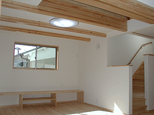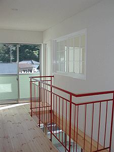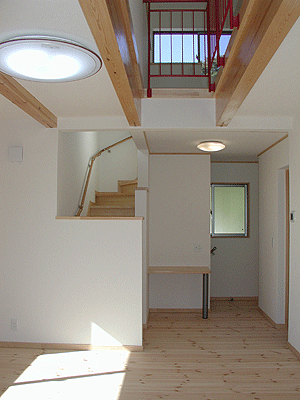 | 2階のリビングから3階の子供部屋に上がる階段。小さな吹抜けもあり、3階の子供達の様子がうかがえます。 |