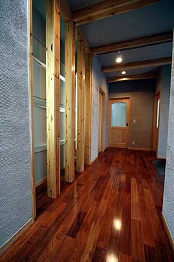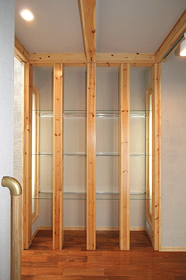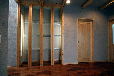 玄関正面にある構造材を使用した飾り棚は住む人のセンスを演出する事ができます。SEの構造材は意匠性も高い材料です。