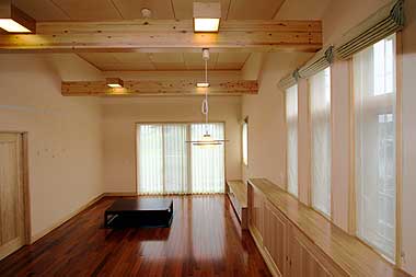 開放感のあるリビング、内装はチーク無垢の床材、