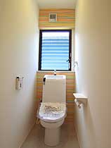 トイレの正面のカラフルな壁紙がとても明るくて