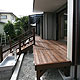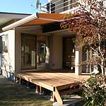 ウッドデッキで仕上げた中庭は、家族と猫の憩いの空間です。電動オーニングにより日射しをカットし、風を呼び込みます。木製格子は、プライベートを確保しながら自然と一体化を図れます。