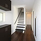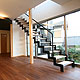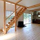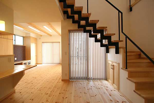パインの床と白い壁のナチュラルな空間にダークブラウンの稲妻 階段がアクセントになっています。