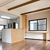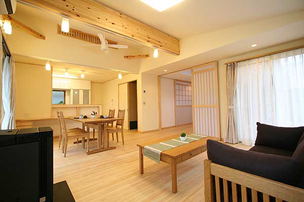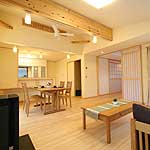 施主さん所有の山の木を天然乾燥させて使用しました。大黒柱、太い梁など木の存在感を感じる室内です。