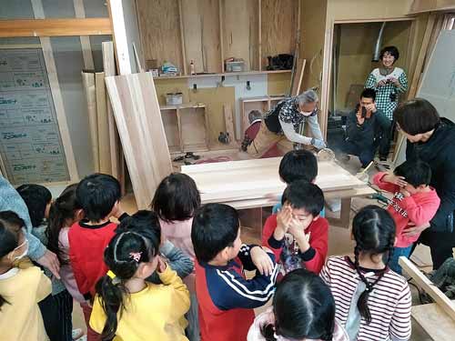子供たちに工事の様子を見せてほしいという事で、工事見学も行いました。子供たちにかんなくずをあげると、とても喜んで感触や匂いを愉しんでいました。