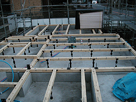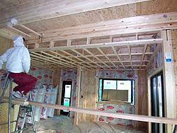 ![]() 1階床の断熱と28m/m合板を施工中。床下からの冷気をカットし、床鳴りのない丈夫な床をつくります。