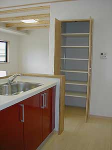 収納はキッチン背面部にフロアカウンターを設け、さらに造り付けで壁面に食品庫も設けました。