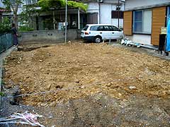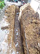 | 外部配管工事のために地面を掘ったところです。地盤調査の結果の通り、軟弱地盤という感じでした。ちなみに、建物の下には鋼管杭を打ってあります。 |