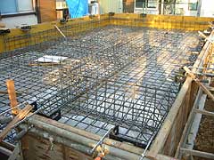 | 鉄筋コンクリートの基礎の中の配筋工事が終わりました。建物全体の重量を受け止め支える基礎。「重量木骨の家」は、この基礎まで一棟一棟構造計算をして、鉄筋の太さや本数(間隔)まで決まります。普通の木造に比べてかなり鉄筋量は増えます。 |