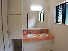 | 洗面化粧台は、オレンジのモザイクタイルを貼った2ボールのオリジナル化粧台です。 |