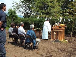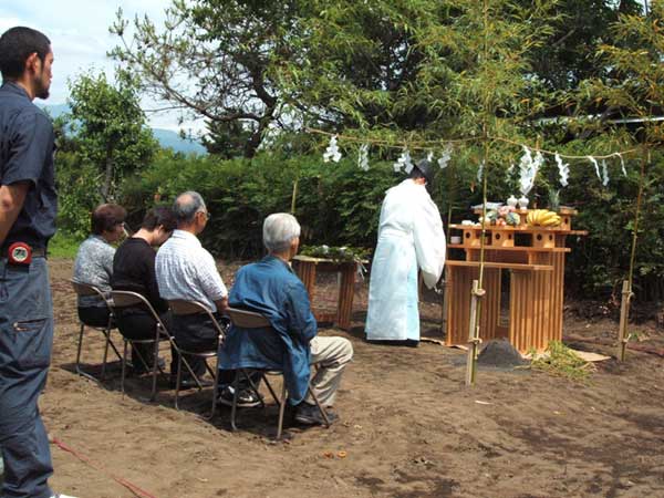 梅雨の晴れ間の晴天に恵まれ、地鎮祭が執り行われました。 工事の安全と立派な建物が出来ることを祈念し、いよいよ新築工事のスタートです。 |
