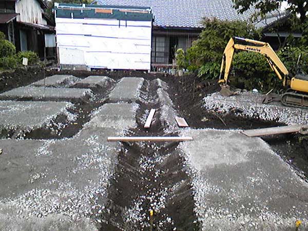 ![]() 基礎の形状に合わせ地盤を掘っています。力のかかる部分は地中梁状になるため、深く掘られています。 |