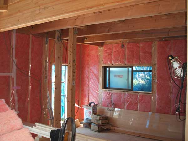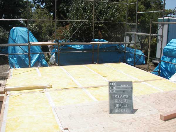 ![]() 外壁部に断熱材の施工をしています。高性能16Kのグラスウール厚さ120o+気密シートです。 |