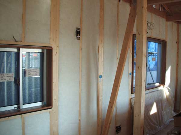 内部造作工事中。壁の断熱材が入りました。この上に気密シートが張られ、壁体内への湿気の侵入を防ぎます。 |
