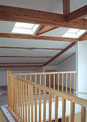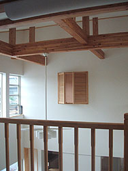 ![]() 大きな吹抜と、それにつながる小屋裏利用の多目的ホールは、開放的な空間です。 |