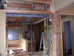 ![]() 大工工事も終わりに近づき、杉板張りの壁も仕上がっています。 |