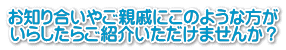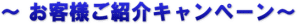 | 【ご紹介キャンペーン規約】 ・新規のお客様をご紹介いただいた場合のみ適用となります。既にご相談中等の場合は適用となりません。 ・ご紹介いただく方へは個人情報保護法の観点から事前に弊社へご紹介する旨を伝えていただき、ご了承を得ていただきますようお願い致します。 ・ご紹介内容に虚偽の内容が含まれている場合には無効とさせていただきます。 |