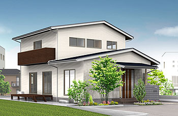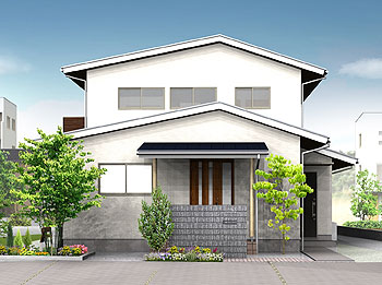 今回の建物は、温かみのある白い外壁にブラウン系のベランダがアクセントになったシンプルな外観です。桧無垢フローリングは優しい木の感触で住む人を心地良くさせてくれます。