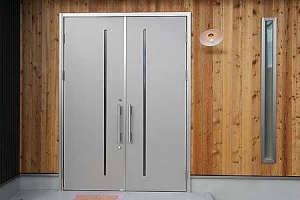 スロープ付きで全開口可能なバイク用の出入り口も断熱性の高い玄関ドアです。