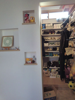 採用して良かったなと思うのは、ファミリー玄関(シューズクロ―ゼット)ですね。靴が散らかっていても隠せるしベビーカーでもなんでも突っ込んでます。 来客時には引戸をピッと閉めます。すると皆さん「広くてきれいにしていますね。」とほめてくれます。