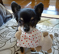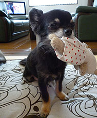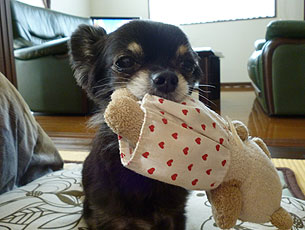 くまさんの人形がお気に入りで、いつもくわえたり、なめたりして遊んでいます。ショコラ君は我が家の大事な大事な次男君です!」 |